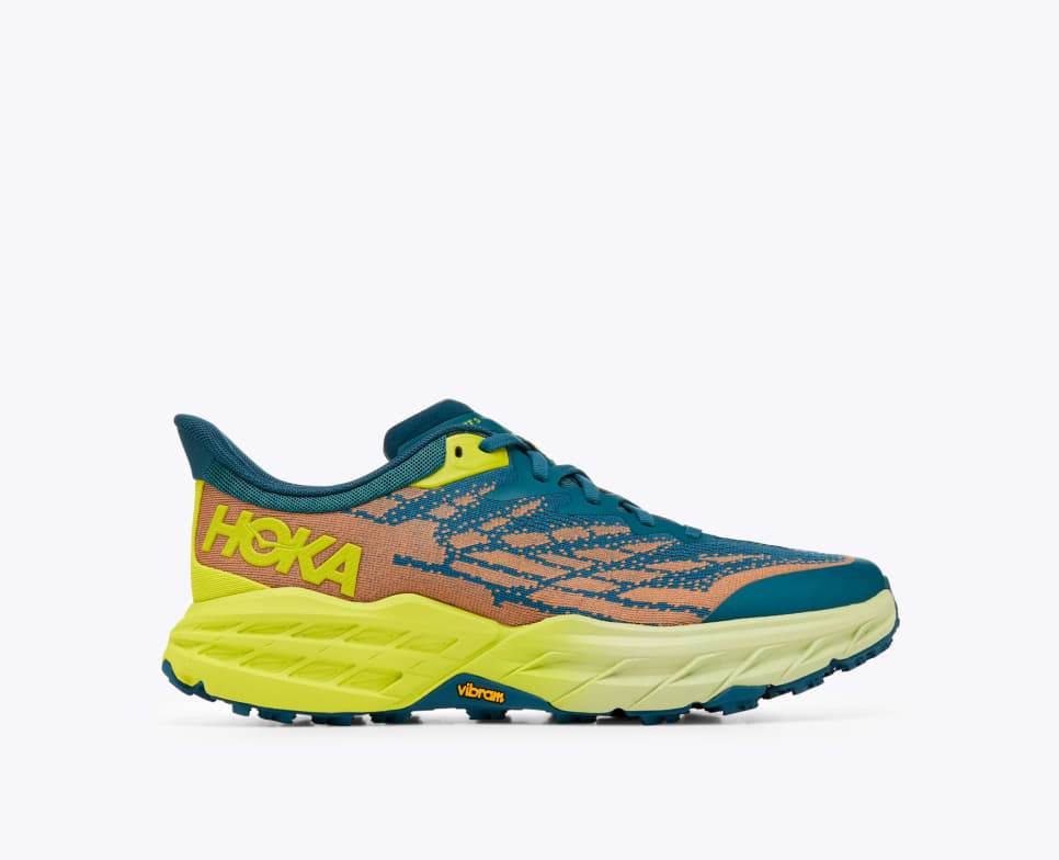 Una calzatura studiata per accompagnarti nei trail tecnici, Speedgoat ritorna in una versione tutta nuova, dalla suola ai lacci. Questa infaticabile scarpa da trail è stata rivisitata e presenta Vibram® Megagrip con Traction Lug, per una presa migliorata e potenza frenante sui terreni sciolti. Un componente tessile dinamico che avvolge la punta e l’avampiede conferisce eccezionale flessibilità e comfort durante la spinta, oltre a essere accogliente in caso di piedi gonfi, una caratteristica già presente in Mafate Speed 3, Evo Mafate 2 ed Evo Speedgoat. I perfezionamenti alla linguetta consolidano la sensazione di maggiore comfort nella parte superiore del piede, vicino alla caviglia dove può verificarsi l’attrito. Il composto dell’intersuola è ancora più leggero di prima, garantendo l’esperienza d’uso fluida che contraddistingue HOKA senza ridurre l’altezza della suola. Tale caratteristica, unita al mesh jacquard a doppio strato, garantisce sicurezza su qualsiasi terreno quando si indossa la nostra superstar del trail.